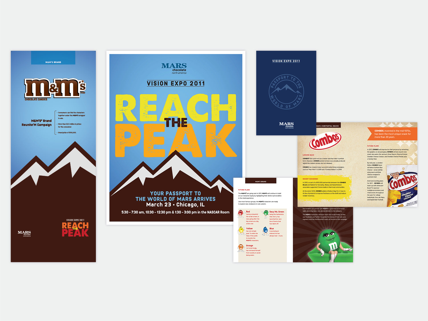 Look and feel for a traveling tradeshow featuring interactive information booths, product demos and maps showing how employees can help Mars Chocolate become #1 in chocolate. Creative includes program logo, booth designs, signage and book featuring Mars Chocolate brands. The “Reach the Peak” theme incorporates vibrant colors and flat vector art to give the tradshow a fun, approachable feel that encourages employee participation.